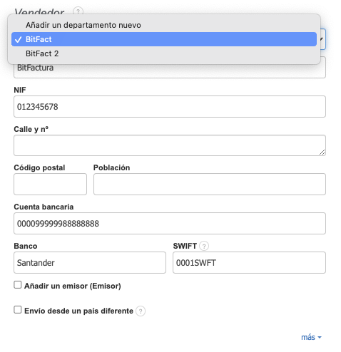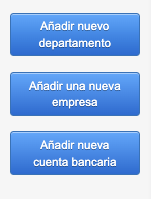 Para cambiar los datos del vendedor de manera rápida y sin errores, es necesario ingresar previamente los departamentos. Para hacer esto, ve a Ajustes > Empresa / Departamento y selecciona el botón correspondiente: Añadir nuevo departamento, Añadir nueva empresa o Añadir nueva cuenta bancaria.
