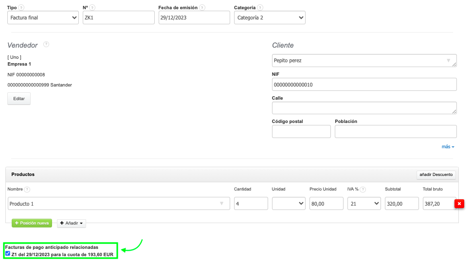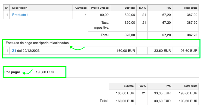 Después de guardar, el monto completo de la transacción y la factura de anticipo vinculada serán visibles en la factura final.