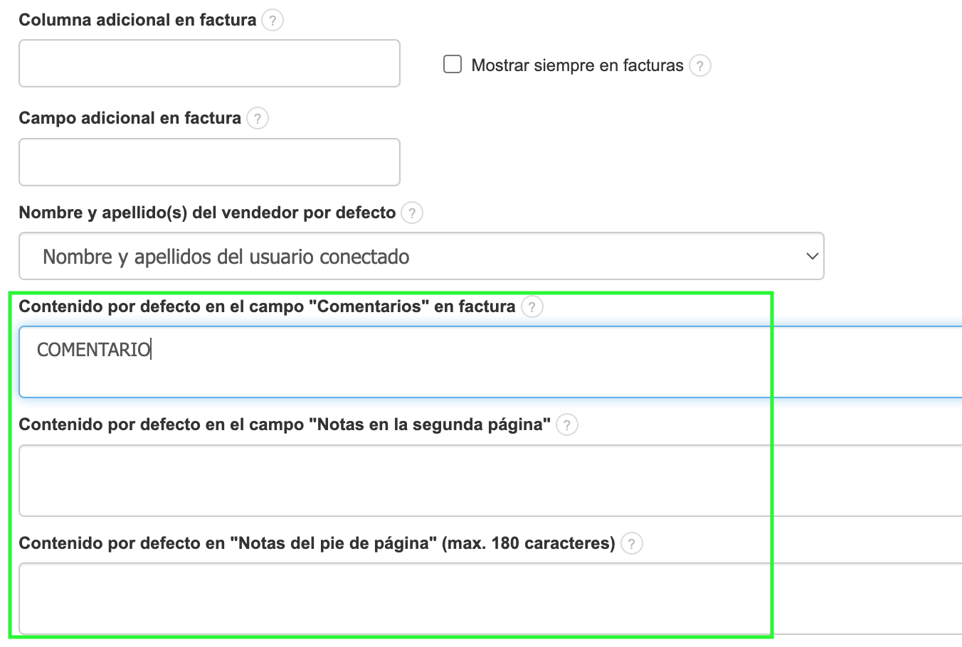 BitFactura permite a los usuarios crear un contenido por defecto en diferentes campos de la factura.