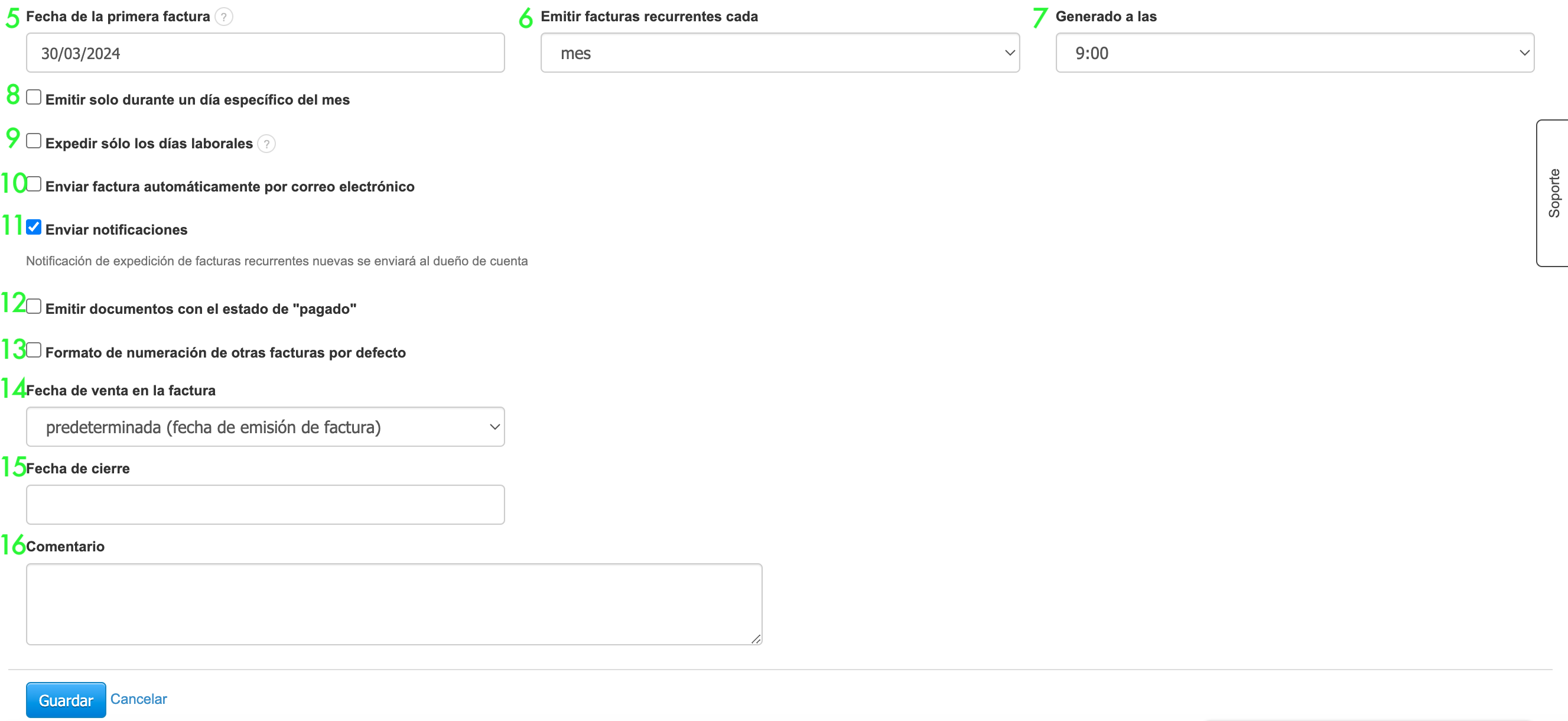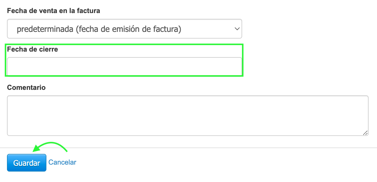 Fecha de cierre: puedes especificar y seleccionar la fecha en la que deseas finalizar el ciclo de generación automática de facturas para un cliente en particular. Esta es también la forma de desactivar la función de factura recurrente.