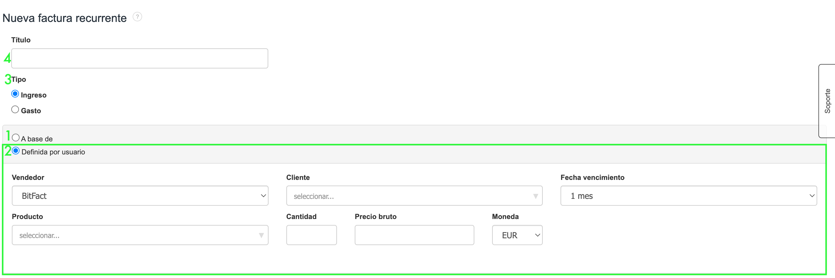 Después de seleccionar la base de la factura recurrente en A base de y Definida por usuario, debes especificar el Tipo de factura, y aquí tenemos dos opciones: Ingreso y Gasto.