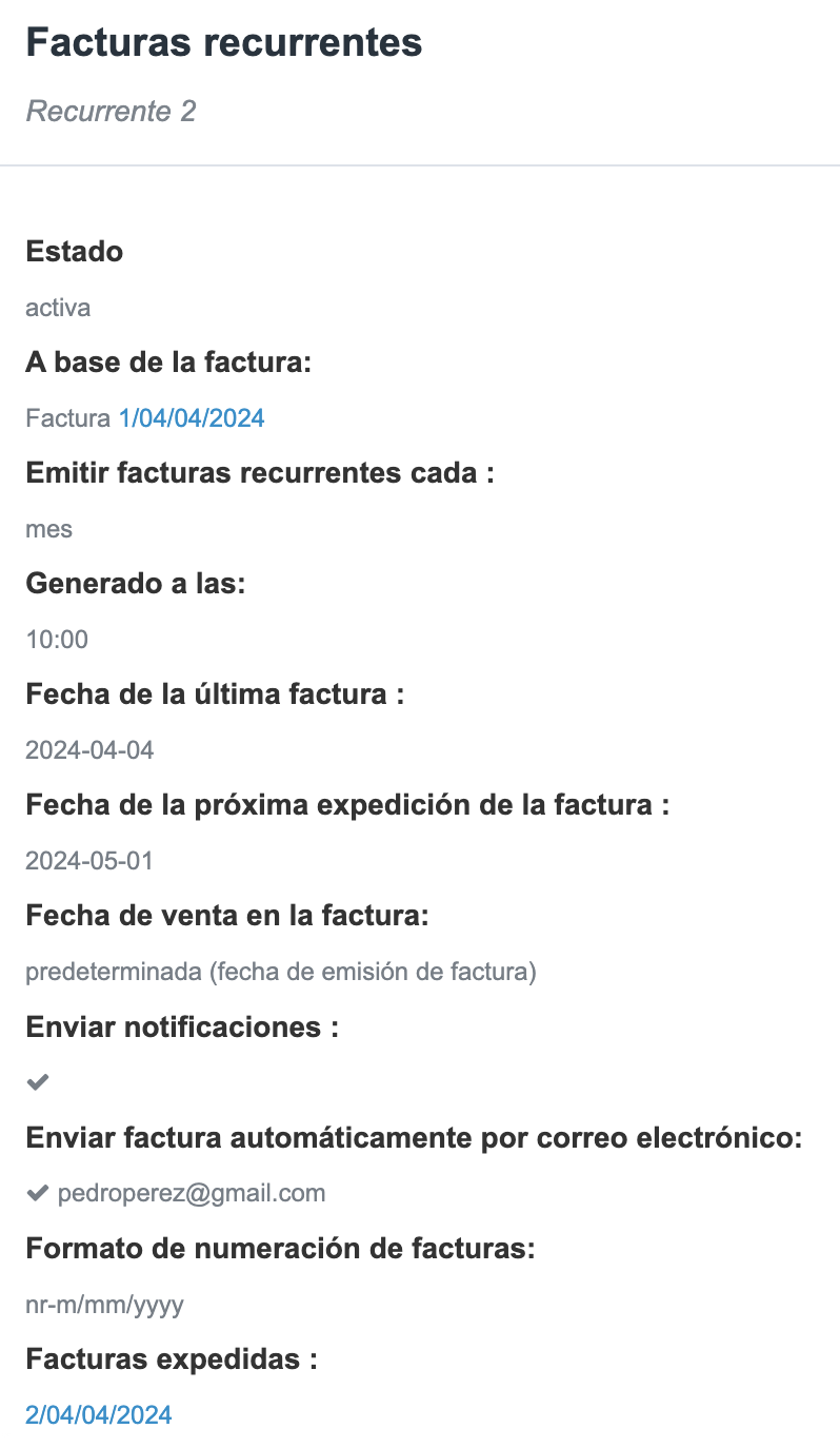 Enviar notificaciones: Al habilitar esta opción, se enviará una notificación a tu correo electrónico cuando se emita una nueva factura recurrente. Después de emitir la factura recurrente y establecer la frecuencia de emisión, no se necesitan acciones adicionales (aparte de, por ejemplo, descargarlas en PDF o enviarlas).