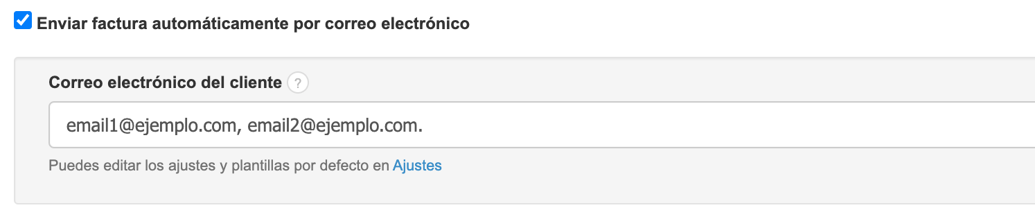Enviar factura automáticamente por correo electrónico: en la ventana que aparece después de seleccionar esta opción, puedes ingresar la dirección de correo electrónico del cliente a la que el programa deberá enviar automáticamente las facturas después de que se emitan. El sistema permite enviar la factura a hasta 5 direcciones de correo electrónico diferentes. Después de cada dirección, utiliza una coma "," por ejemplo: email1@ejemplo.com, email2@ejemplo.com.