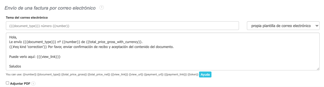 Algunas de las variables más comúnmente utilizadas incluyen: {{document_type}} - tipo de documento; {{number}} - número de documento; {{total_price_gross}} - precio total bruto; {{total_price_net}} - precio total neto; {{view_link}} - enlace de vista previa; {{view_url}} - dirección URL; {{payment_url}} - dirección de pago; {{payment_link}} - enlace de pago.