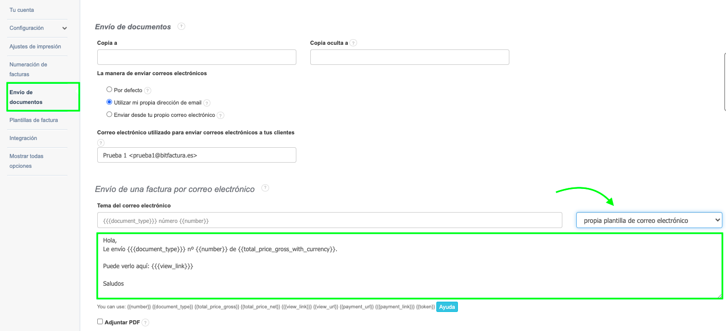 Puedes configurar el contenido del mensaje enviado en Ajustes > Ajustes de la cuenta > Envío de documentos para la configuración general de la cuenta. Si deseas establecer el contenido del mensaje para un departamento específico, ve a Ajustes > Empresa/Departamento > haz clic en el ícono de engranaje junto al departamento y elige Editar > marca la casilla para Configuración de envío de documentos por correo electrónico. La información detallada sobre el envío de documentos por correo electrónico se describe aquí.