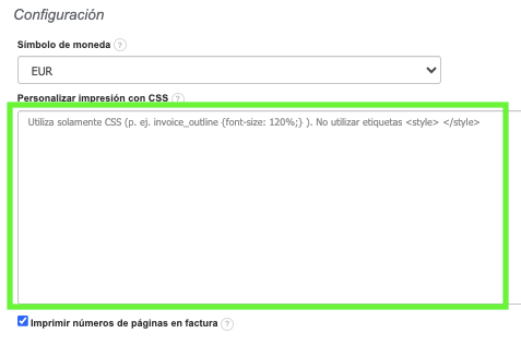 - Cambiar el color y tamaño de otros elementos en la impresión/PDF de la factura mediante códigos CSS más avanzados