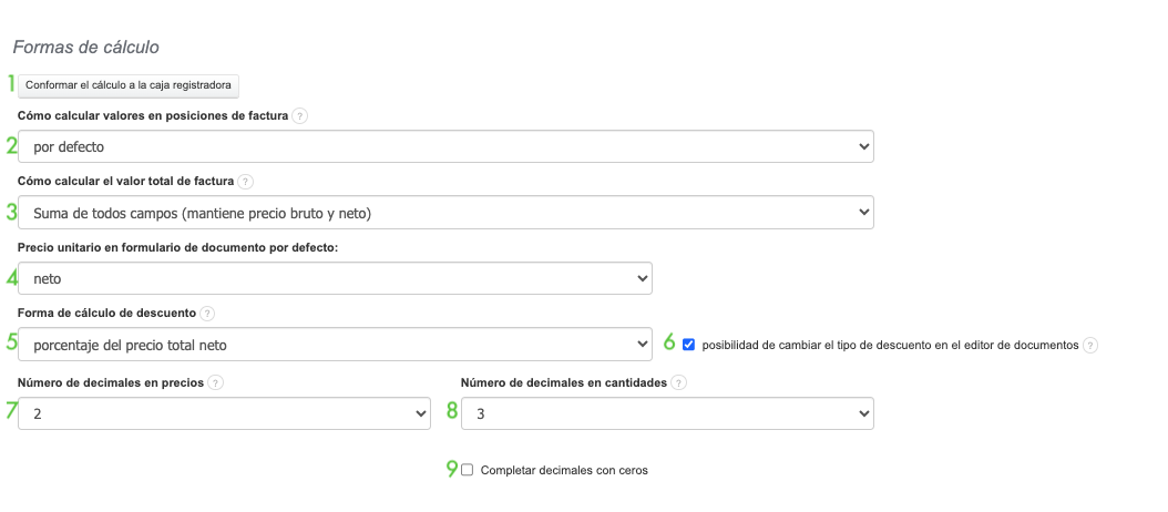 El punto 1 describe la configuración de cálculo según la caja registradora fiscal:
