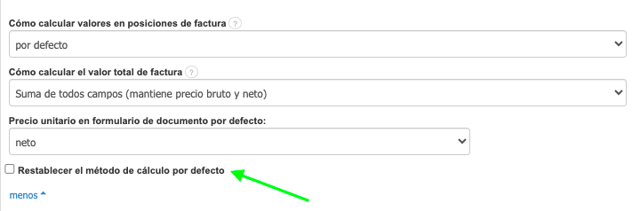 Cada factura tiene guardada la configuración de cálculo tal como estaba en el momento de su generación. Para cambiar esto, edita la factura y luego haz clic en la pestaña 'Ver más opciones'