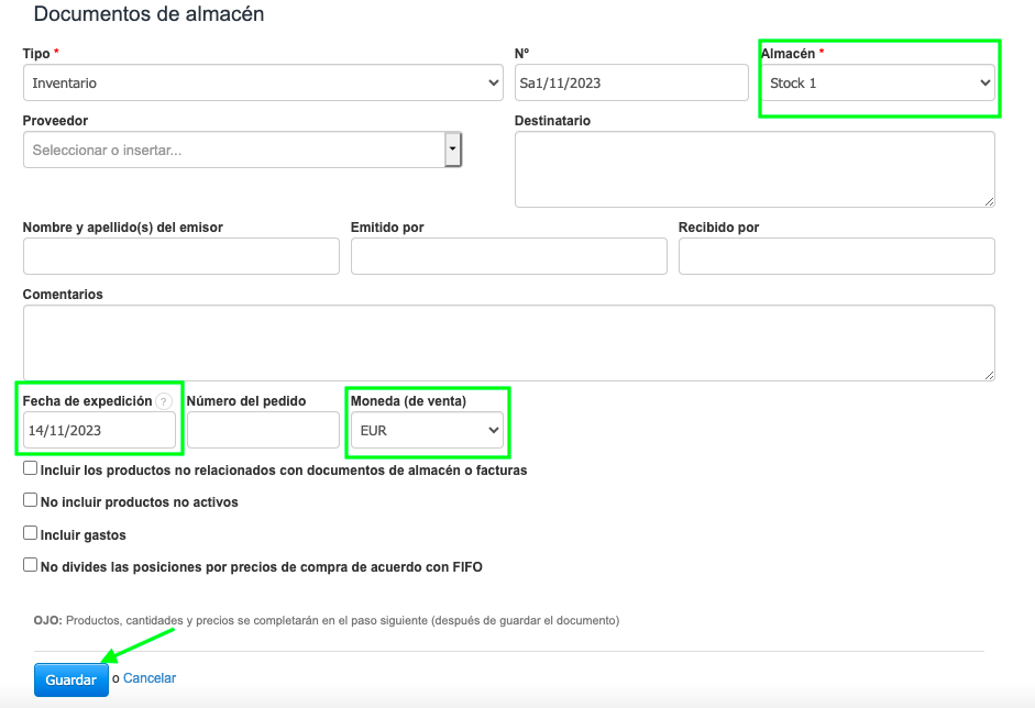 La opción de marcar la casilla No incluir productos no activos también es importante. Te permite omitir productos que tienen el estado de productos inactivos en el documento de inventario. Puedes obtener más información sobre productos inactivos aquí.
