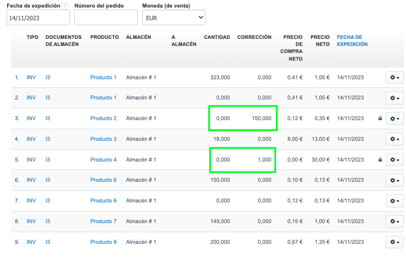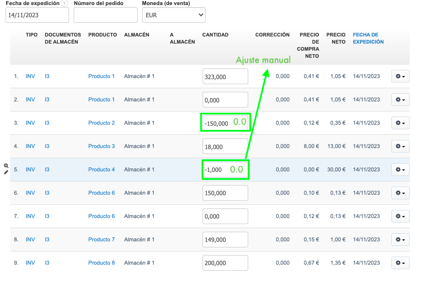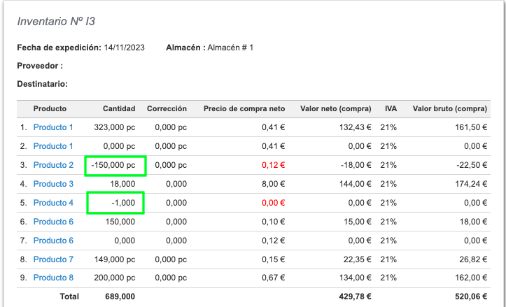 La imagen anterior muestra intencionalmente dos ejemplos con cantidades negativas de algunos productos para llamar la atención sobre la opción de vender productos que no están en stock. Esto significa que hemos emitido más documentos SM (Salida de Mercancías) que documentos IM (Ingreso de Mercancías) para un producto específico (esto ocurre si no marcas la opción No permitir vender productos que no están en los almacenes en Ajustes> Ajustes de cuenta > Configuración > Pestaña Productos.