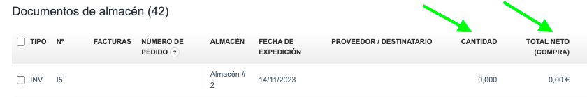 Cuando creas un resumen de documentos de almacén en la pestaña Almacenes> Documentos de almacén, puede suceder que aparezcan ceros en las columnas de cantidad y total neto para el documento de inventario