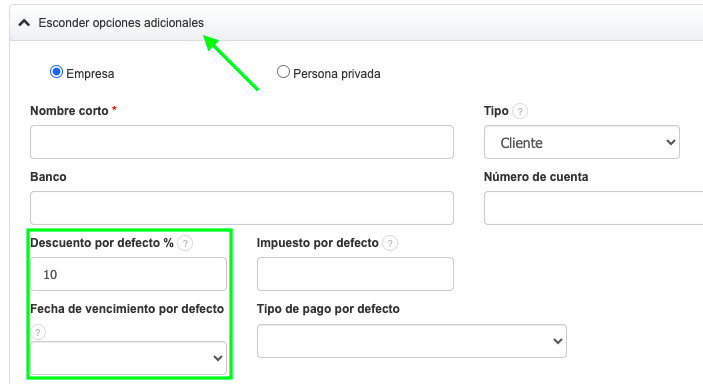 - Selecciona Descuento por defecto % y Fecha de vencimiento por defecto