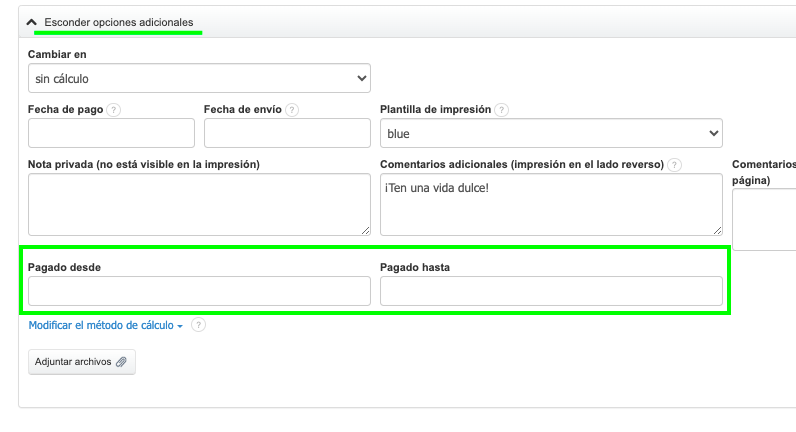 Después de guardar los cambios en la configuración y al intentar crear un documento, aparecerán dos ventanas en la sección Ver más opciones llamadas: Pagado desde, Pagado hasta. Elija allí las fechas apropiadas
