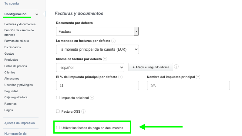 Al emitir facturas por servicios cuya realización es a largo plazo, como una suscripción, puedes, al generar dicho documento, establecer las fechas en las que se deben proporcionar los servicios. A menudo, estas son las fechas de conclusión y terminación del acuerdo vigente entre el Vendedor y el Comprador. Para activar esta función, ve a Ajustes > Ajustes de cuenta > Configuración > Facturas y documentos > Utilizar la fecha de pago en documentos.