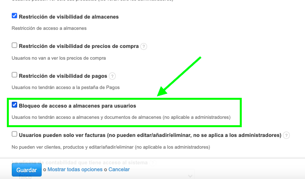 También es posible restringir completamente el acceso del usuario a almacenes y documentos de almacén en todo el sistema. Esto se hace siguiendo los mismos pasos que en las instrucciones anteriores, excepto que la casilla que debes seleccionar en este caso es Bloqueo de acceso a almacenes para usuarios