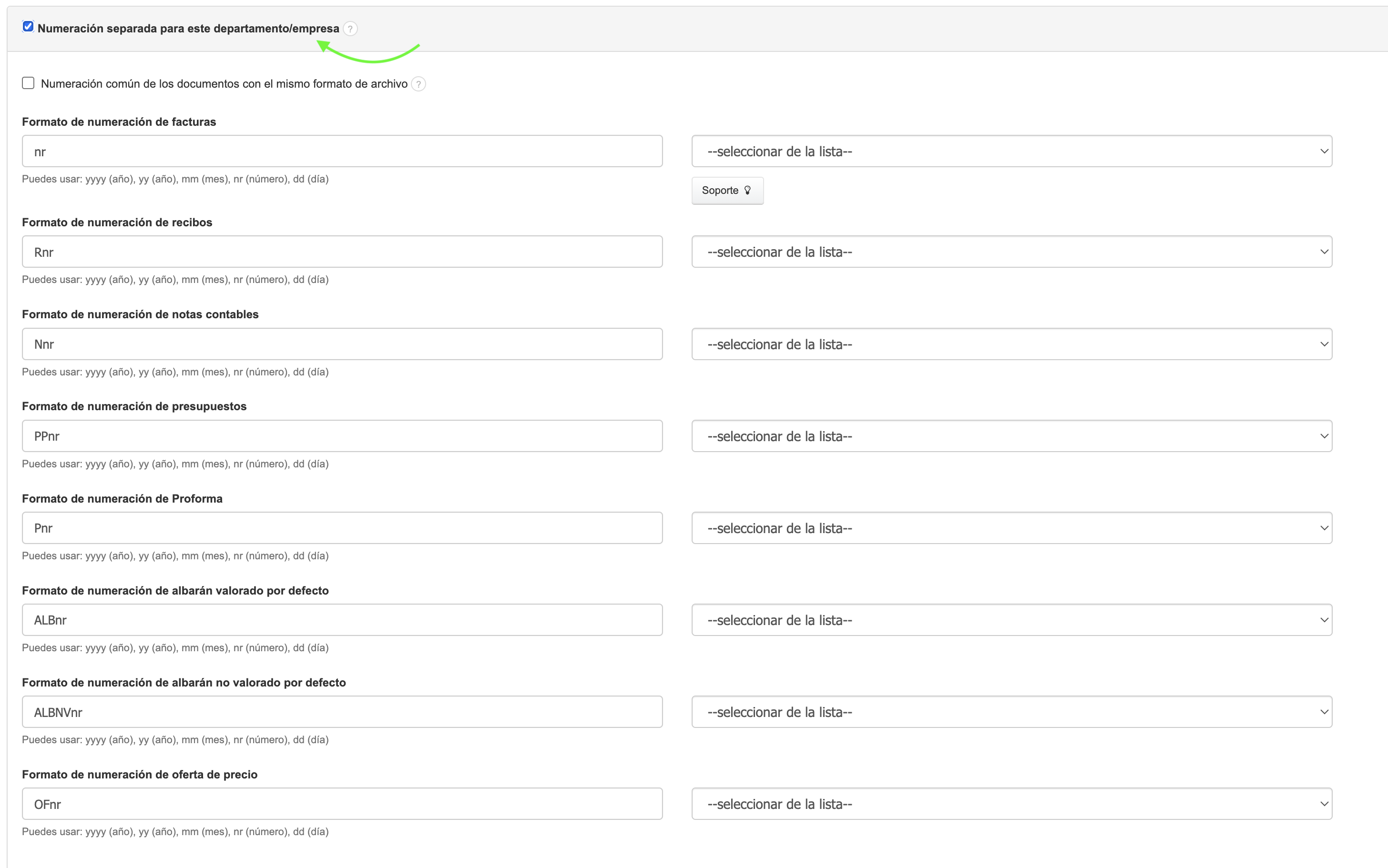 Muchos clientes piensan que simplemente marcar esta opción resultará en una numeración separada. Para que los documentos se numeren de manera separada en diferentes departamentos, después de marcar esta opción, realiza un cambio en el formato de numeración, como agregar la abreviatura de la empresa o información específica del departamento al principio o al final del formato, o elige un formato completamente diferente. Otro cambio simple es introducir separadores diferentes; por ejemplo, en lugar de "/", puedes usar "." u otro carácter. Debe haber al menos un carácter de diferencia en el formato de numeración para garantizar una numeración separada para cada departamento.