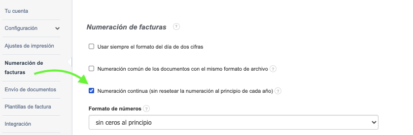 Si lo necesitas, también puedes marcar la opción para la Numeración Continua (sin resetear la numeración al principio de cada año) de Documentos. Esta opción te permite mantener una continuidad absoluta en la numeración, lo que significa que al comenzar el nuevo año, la numeración no empezará desde el número 1, sino que continuará según la secuencia del año anterior.