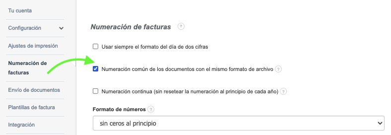 - En el menú de la izquierda, selecciona Numeración de facturas; aquí verás el formato de numeración predeterminado actual para varios tipos de documentos.