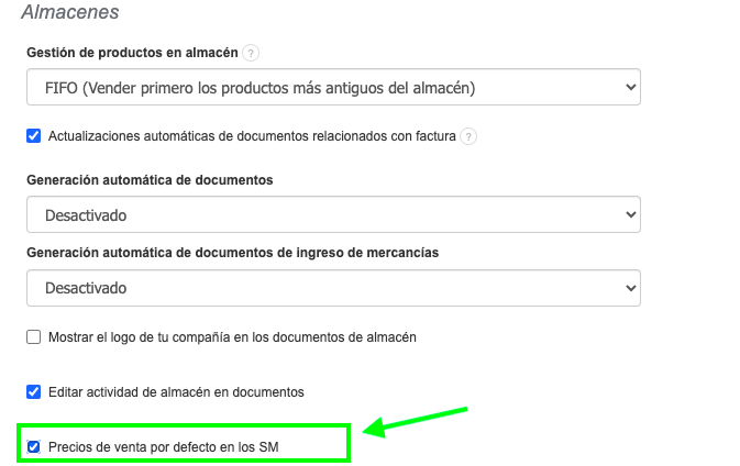 Para hacerlo, ve a Ajustes > Ajustes de cuenta > Configuración > Almacenes y marca la casilla Precios de venta por defecto en los SM.
