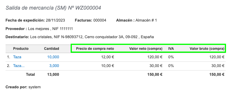 Desde ya hace un tiempo, hemos establecido que el precio predeterminado en los documentos de almacén de SM en nuestro sistema es el precio de compra. Un ejemplo de un documento de almacén se ve de la siguiente manera: