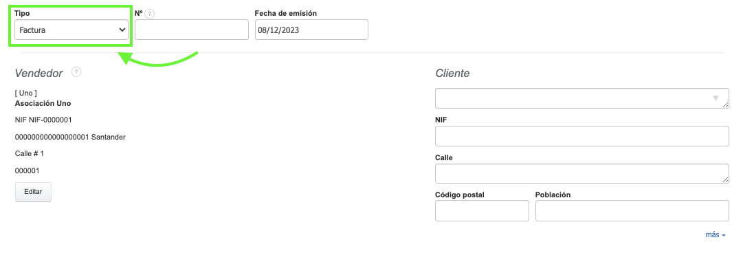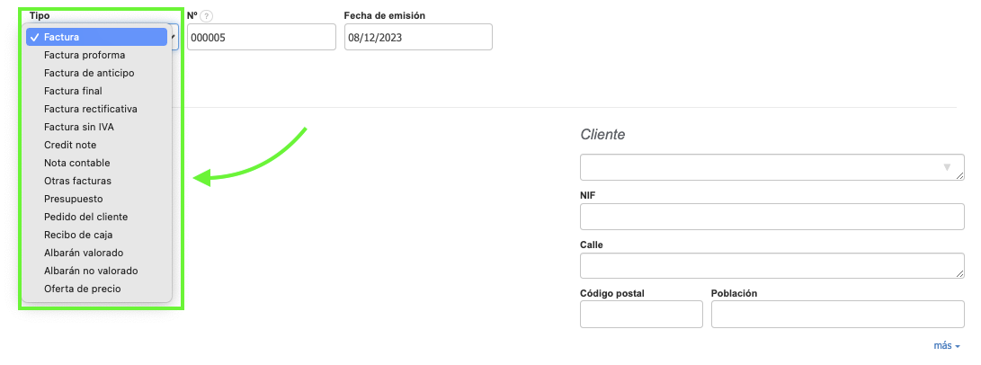 4. Haciendo clic en este campo, puedes cambiar el tipo de documento seleccionándolo de la lista mostrada. La lista incluirá aquellos documentos que están activos en la sección Documentos adicionales a emitir.
