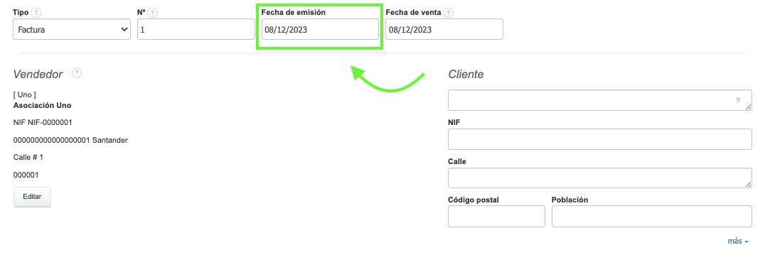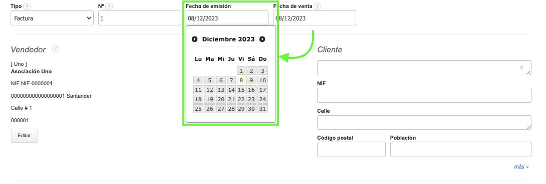 Cambiar la fecha de emisión también afecta al cambio en la fecha de venta. Sin embargo, la fecha de venta no tiene que ser la misma que la fecha de emisión. Para cambiar la fecha de venta, al igual que en el caso de la fecha de emisión, haz clic en el campo indicado y elige el año, mes y día mediante el calendario mostrado.