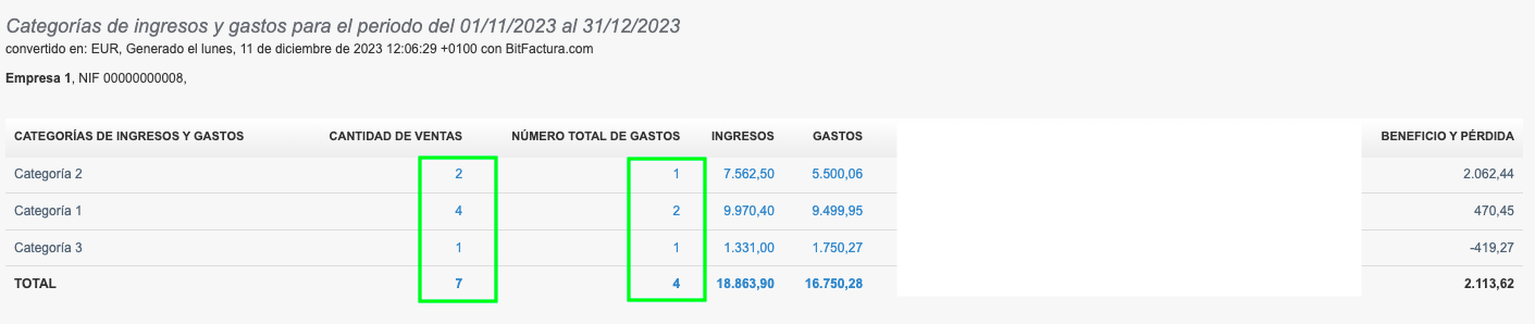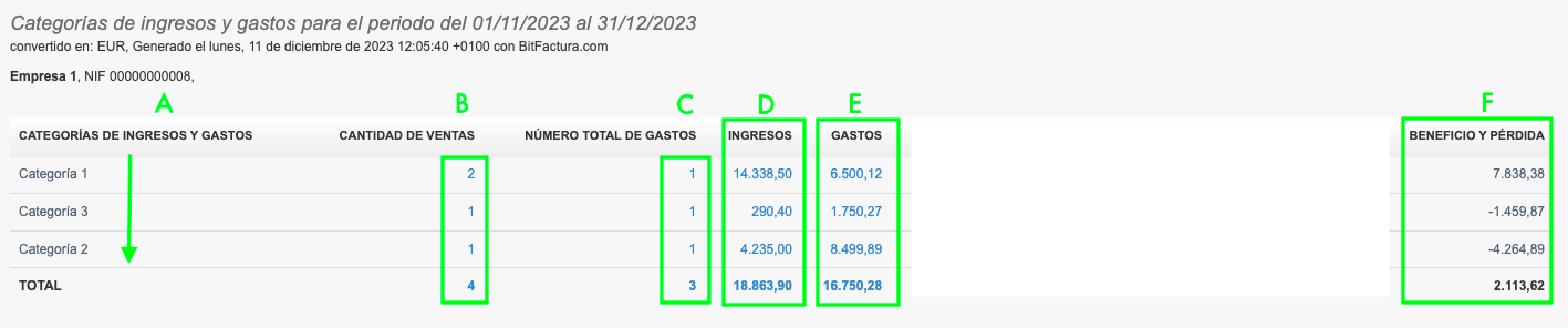 A - categorías recopiladas que aparecieron en documentos de ventas y costos. B y C - número de facturas en la parte de ingresos y gastos que han sido asignadas a la categoría correspondiente. D y E - conteo separado de ingresos y gastos por categorías. F - conteo de beneficios y pérdidas