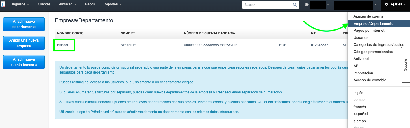 En la información del vendedor en el documento emitido, se pueden ver detalles básicos como el nombre, la dirección o el número de identificación. En los detalles de la empresa, también puedes añadir información bancaria como el nombre del banco, el número de cuenta bancaria, su moneda y el código SWIFT. El código SWIFT es un identificador internacional para una institución financiera que participa en el sistema SWIFT. En este documento, aprenderás dónde ingresar el código SWIFT para que aparezca en la información del vendedor en la factura