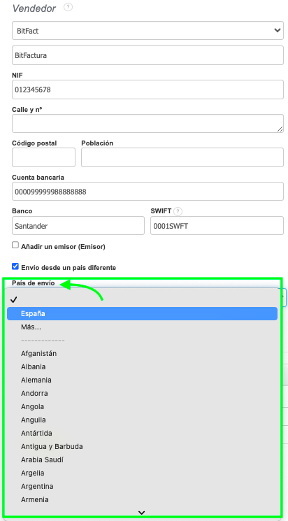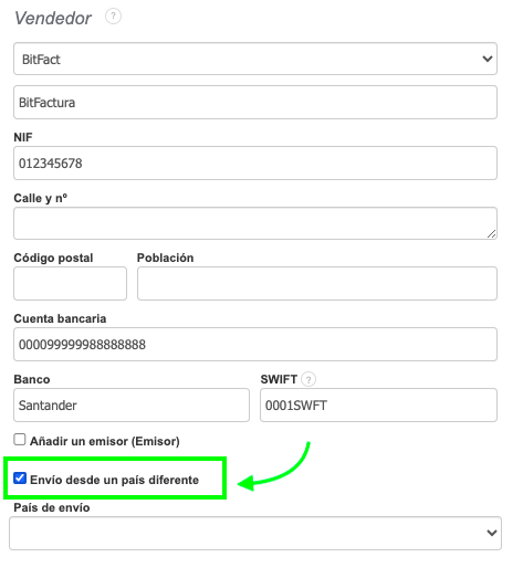 Opción para envíos desde otro país en los datos del vendedor.