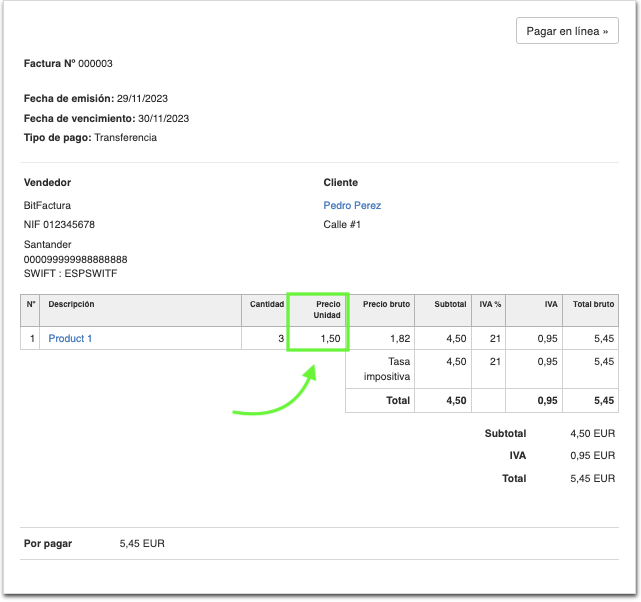 En los documentos creados dentro de la cuenta, se mostrará una sección con el precio unitario neto.