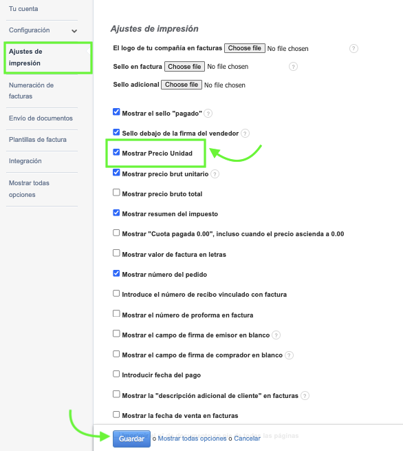 - Marca la casilla junto a la opción Mostrar Precio Unidad
