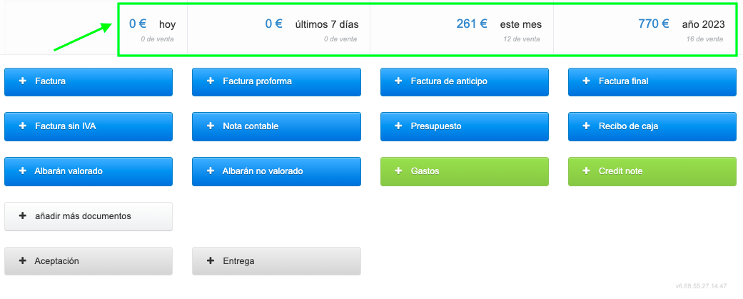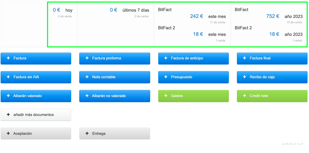 Después de iniciar sesión en la cuenta en el sistema, el usuario ve la pantalla principal con botones para emitir documentos. La pantalla principal también muestra estadísticas de ventas divididas en: hoy, últimos 7 días, mes actual y año. Al gestionar Empresas/Departamentos en BitFactura, puedes obtener un desglose del resumen de ventas para estas Empresas/Departamentos. Para hacerlo, ve a Ajustes > Ajustes de cuenta > Configuración > Reportes y selecciona la casilla Mostrar el resumen de ingresos (de la página principal) dividido entre departamentos Después de guardar los cambios, la página principal mostrará un desglose detallado de las cantidades de ventas con distinción por Empresa/Departamento