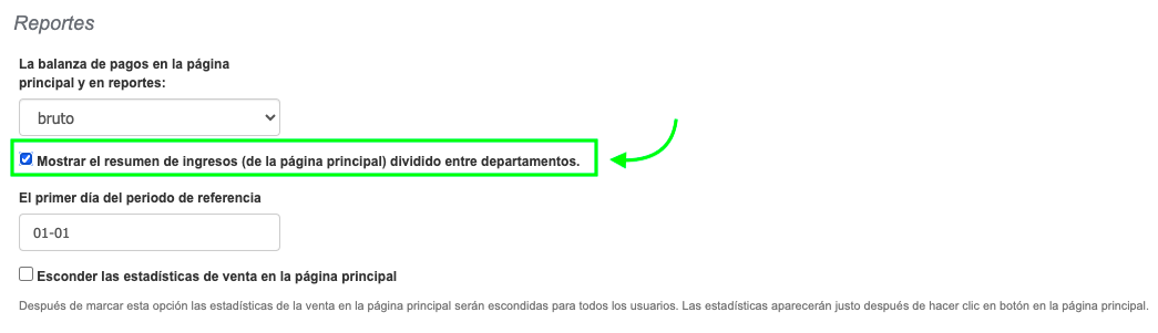 Estadísticas de ventas en la página principal: división por Empresas/Departamentos