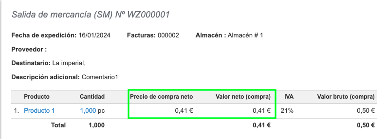 En el caso de emitir documentos de almacén junto con las facturas, el precio de venta se toma de la factura de venta y el precio de compra se toma del documento IM; también puedes encontrar información sobre este precio en el documento SM.