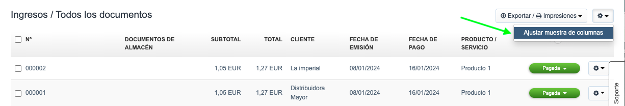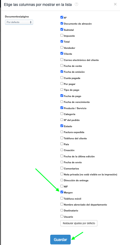 Esta opción, se muestra para los siguientes tipos de documentos: factura, factura de anticipo y factura final. Para ver el margen, ve a Ingresos/Factura > Todo/Factura y, en el lado derecho, sobre la lista de facturas, utiliza el botón de función y selecciona Ajustar muestra de columnas.