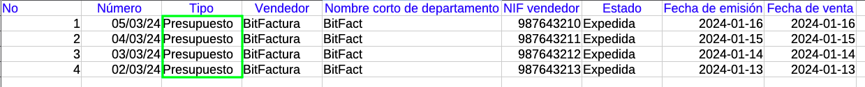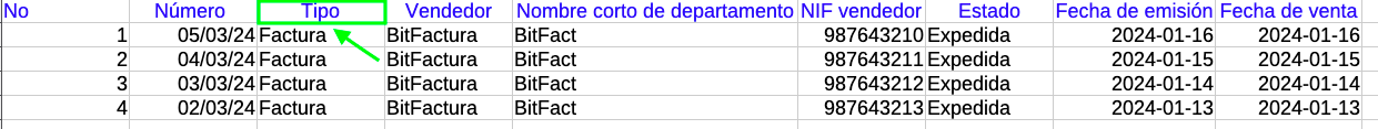 Si deseas importar otros documentos diferentes a facturas, cambia el nombre en la columna Tipo en el archivo guardado en tu computadora para importar (con la extensión como se indica a continuación*)