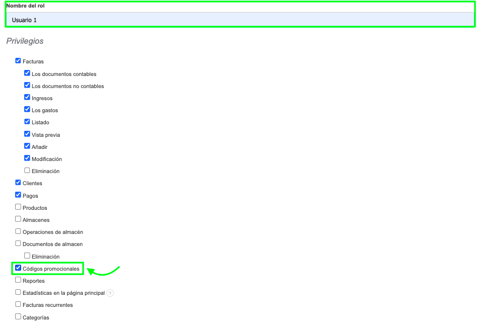 Para otorgar privilegios para acceder a códigos promocionales al crear un nuevo rol: