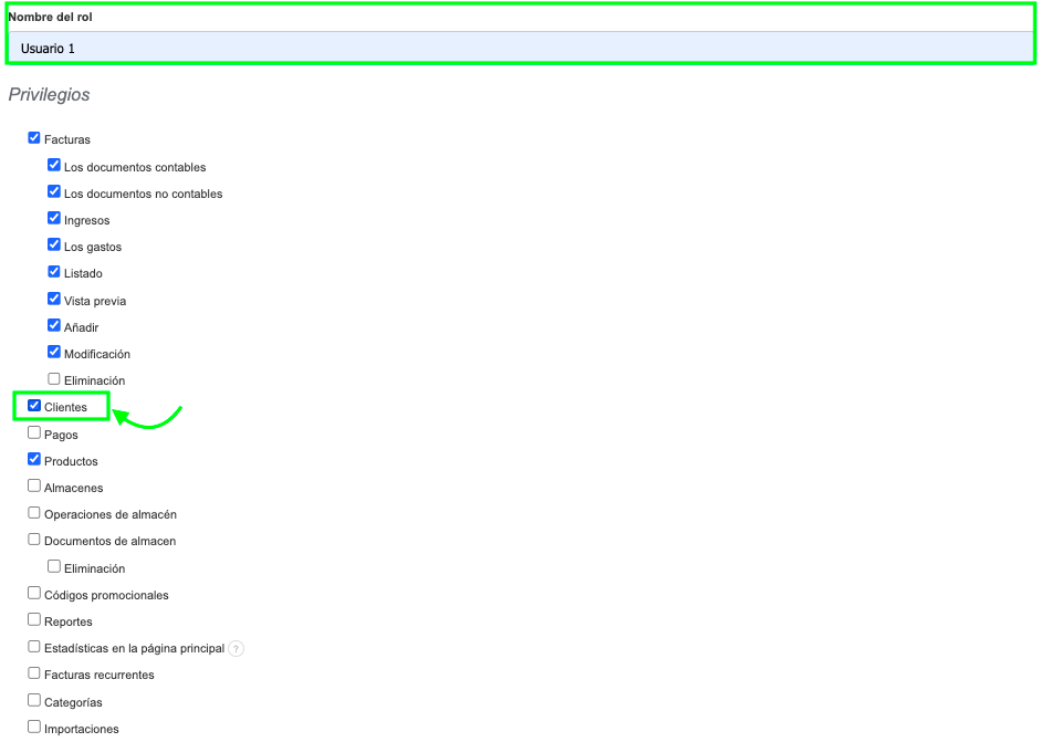 - Para otorgar acceso a la base de datos de clientes, marca la casilla junto a la opción Clientes.