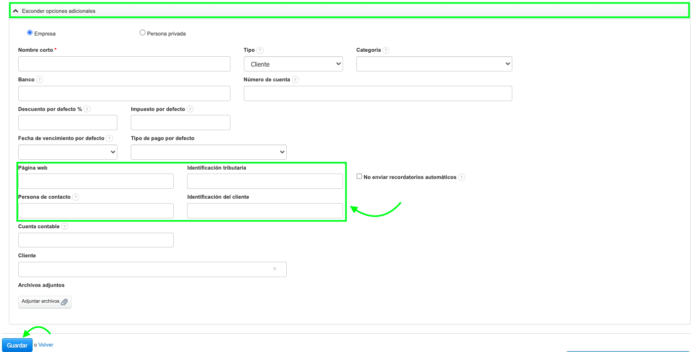 - Entre las opciones disponibles, puedes completar datos como: Página web, Identificación tributaria, Identificación del cliente.
