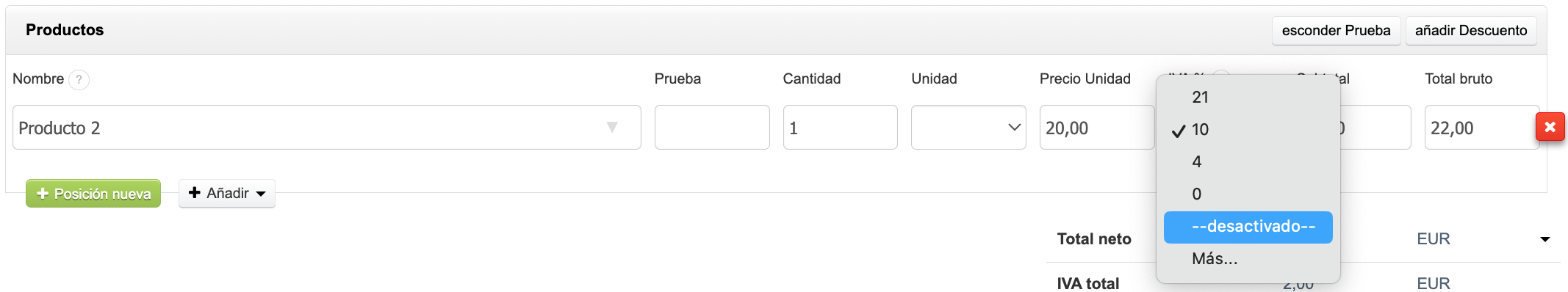 También puedes desactivar la columna del IVA cada vez que emites un documento seleccionando --desactivado-- en la columna específica.