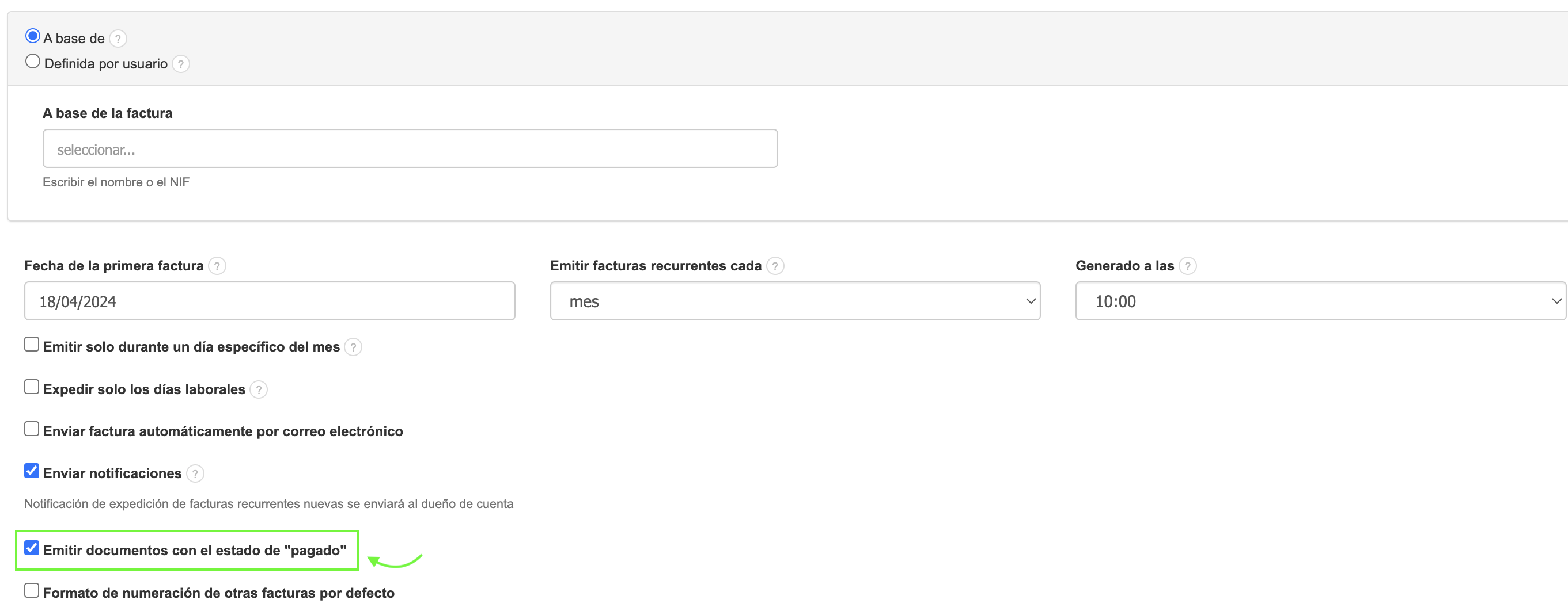 - marca la casilla junto a la opción Emitir documentos con el estado de "pagado" para asignar automáticamente ese estado a las facturas.