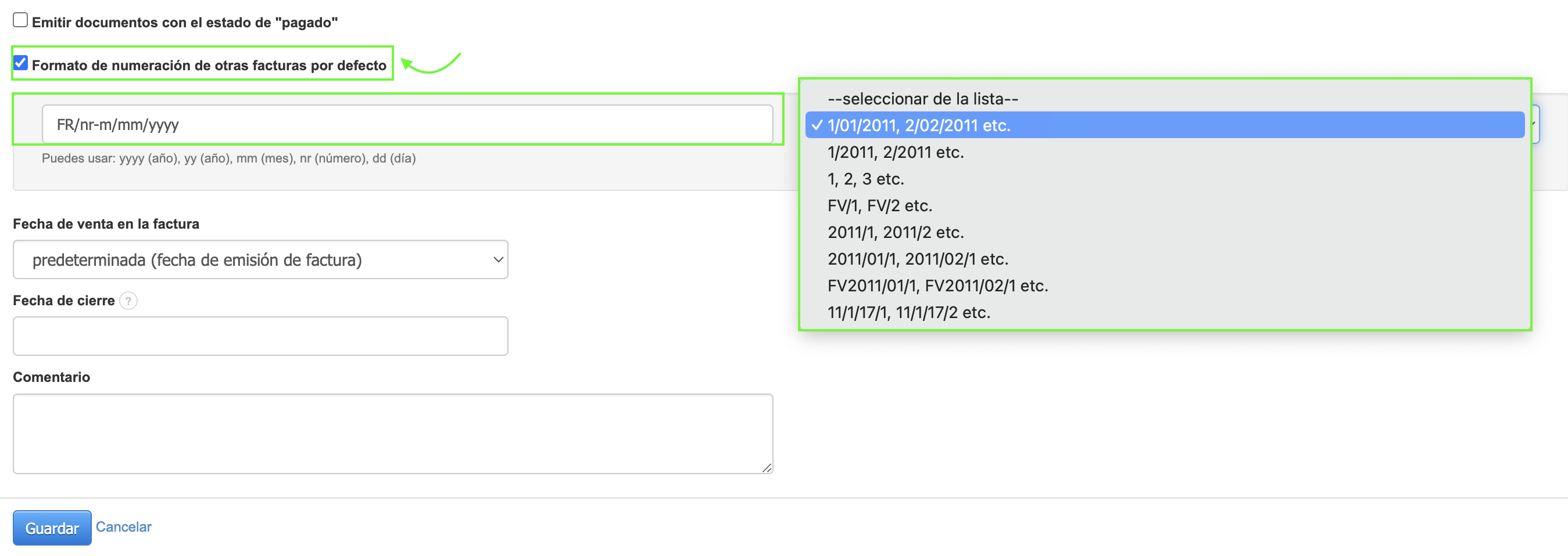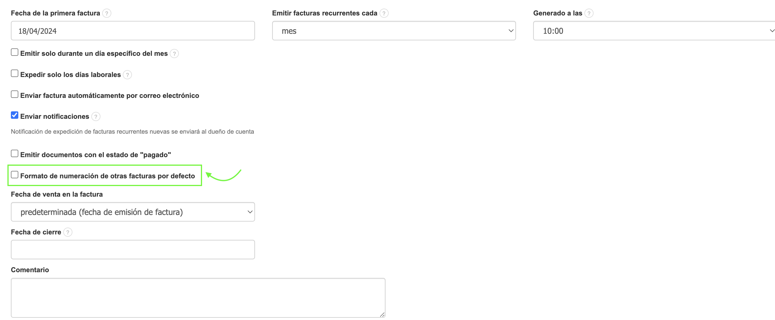 - marca la casilla junto a la opción Formato de numeración de otras facturas por defecto.