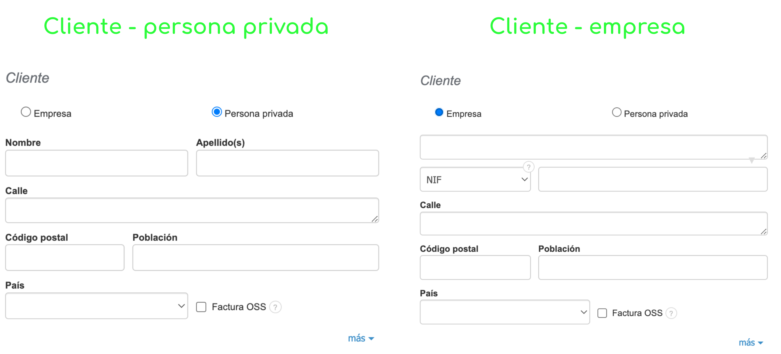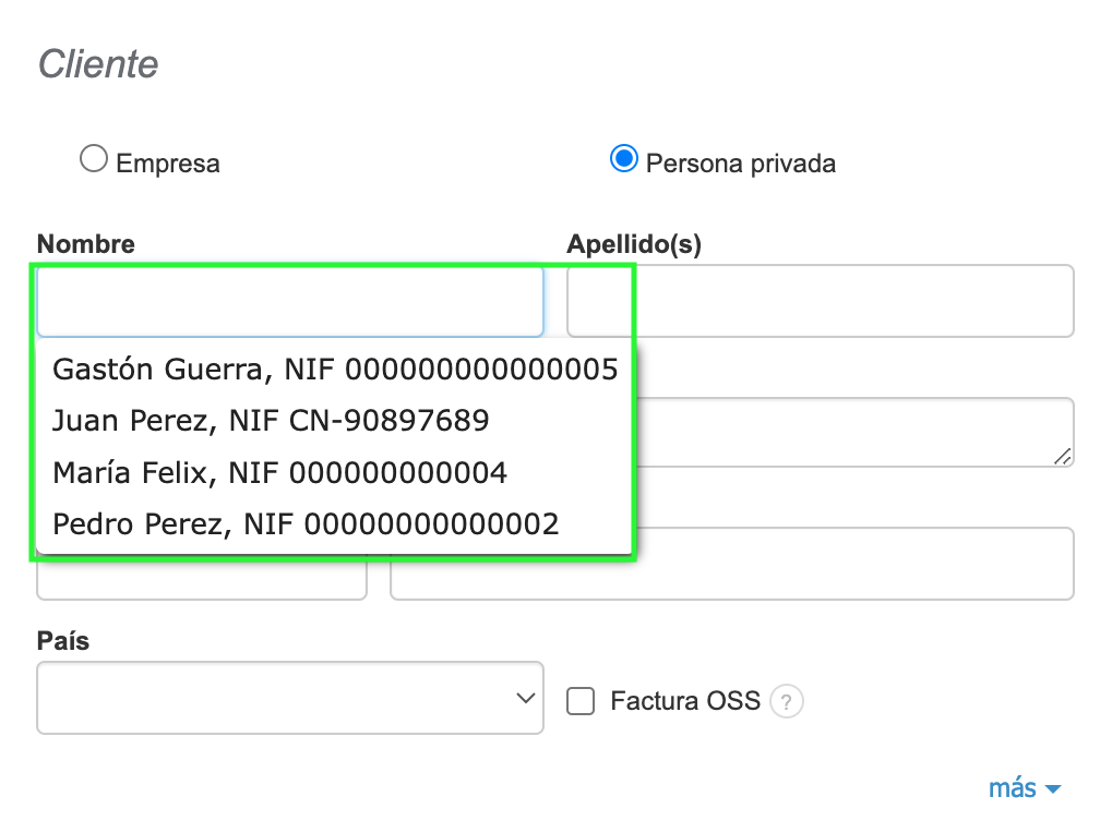 Puedes elegir si el cliente es una empresa o una persona individual marcando la casilla designada. Los campos a completar serán ligeramente diferentes. Por ejemplo, en el caso de una empresa, aparecerá un campo adicional para proporcionar el número de identificación fiscal (NIF), y para una persona privada, aparecerán campos para el Nombre y Apellido del Cliente.