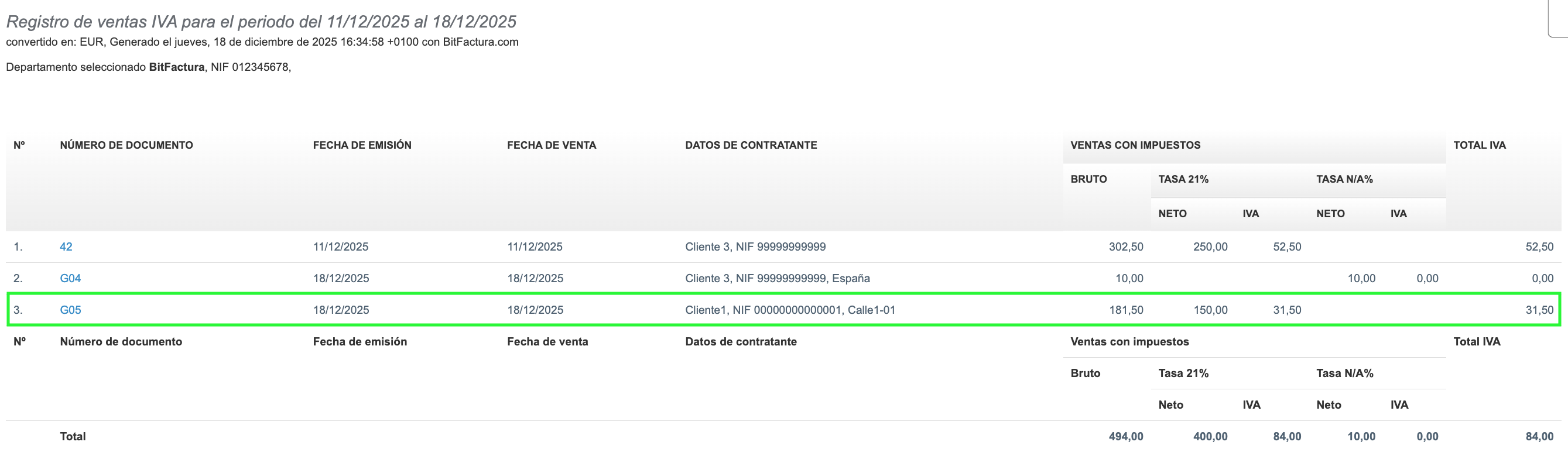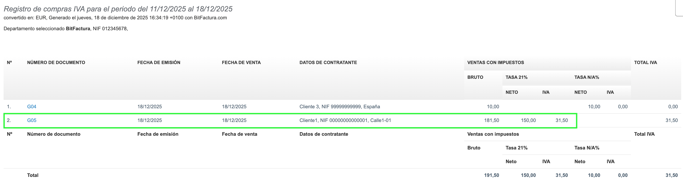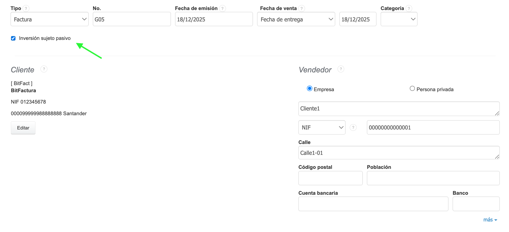 En el sistema BitFactura, puedes contabilizar correctamente las facturas de gastos sujetas al mecanismo de inversión sujeto pasivo (como por ejemplo, las adquisiciones intracomunitarias de bienes, la importación de servicios o las transacciones internacionales) aplicando el tipo de IVA nacional únicamente con fines declarativos. Para ello, se utiliza una línea técnica que no afecta a la apariencia de la factura, pero permite la correcta inclusión del documento en los registros del IVA.