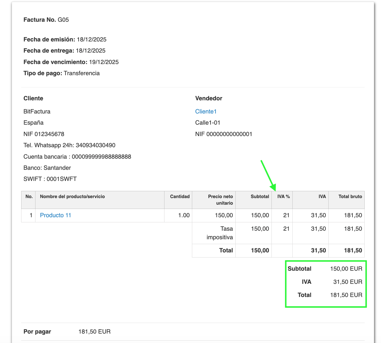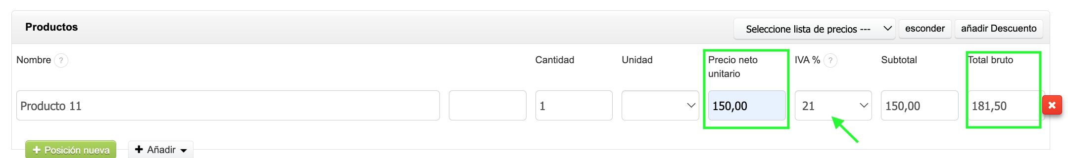 - En la línea de productos de la factura, introduce el importe neto de la factura de ventas del cliente y especifica el tipo de IVA correspondiente que te aplica como cliente.