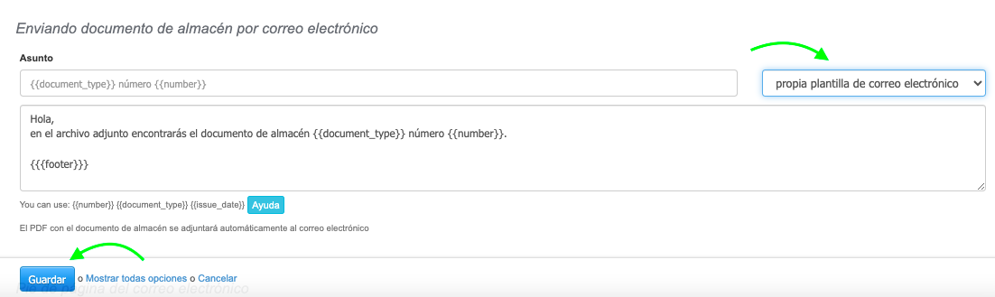 Para editar el contenido del correo electrónico desde la configuración global de la cuenta, ve a Ajustes > Ajustes de cuenta > Envío de documentos > Sección Enviando documento de almacén por correo electrónico. Junto al campo de Título, cambia la plantilla de correo electrónico por defecto por propia plantilla de correo electrónico. Con este cambio, el campo de contenido se activa, permitiéndote definir tu propio contenido de mensaje. Confirma los cambios en el contenido con el botón Guardar en la parte inferior de la página.
