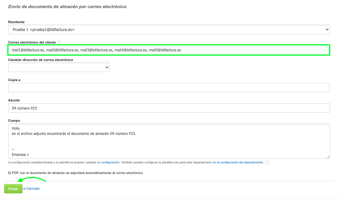 *NOTA: Un documento de almacén se puede enviar a un máximo de 5 destinatarios diferentes a la vez, y sus correos electrónicos deben separarse por comas.