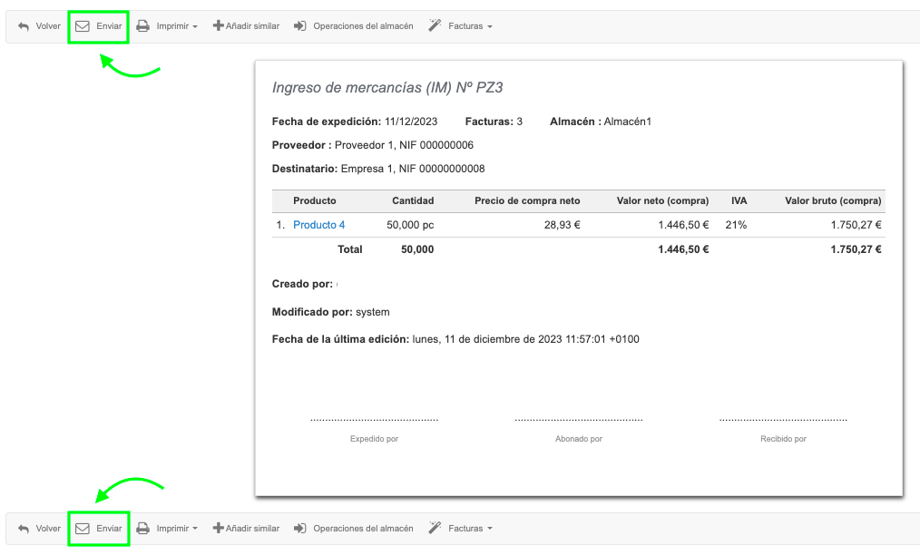 El formulario para enviar documentos de almacén por correo electrónico se activa desde la vista previa del documento de almacén. Haz clic en el menú superior Almacén > Documentos de Almacén, luego abre el documento que deseas enviar. Desde la barra superior/inferior en la vista previa del documento de almacén, selecciona la opción de Enviar.