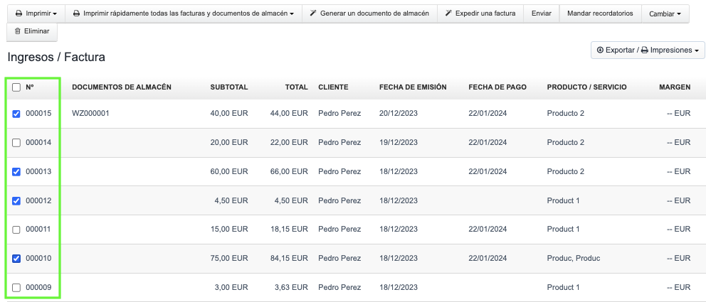 Cuando el panel de filtros no te proporciona los resultados de búsqueda adecuados para los documentos en la lista, puedes seleccionar ventanas individuales junto a las facturas y luego utilizar el botón de Exportar/Impresiones.