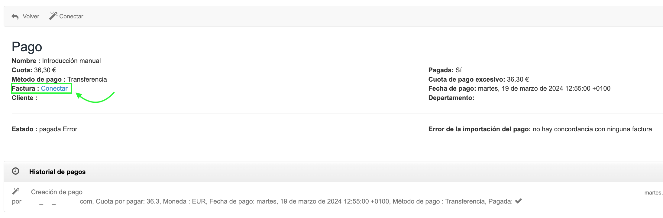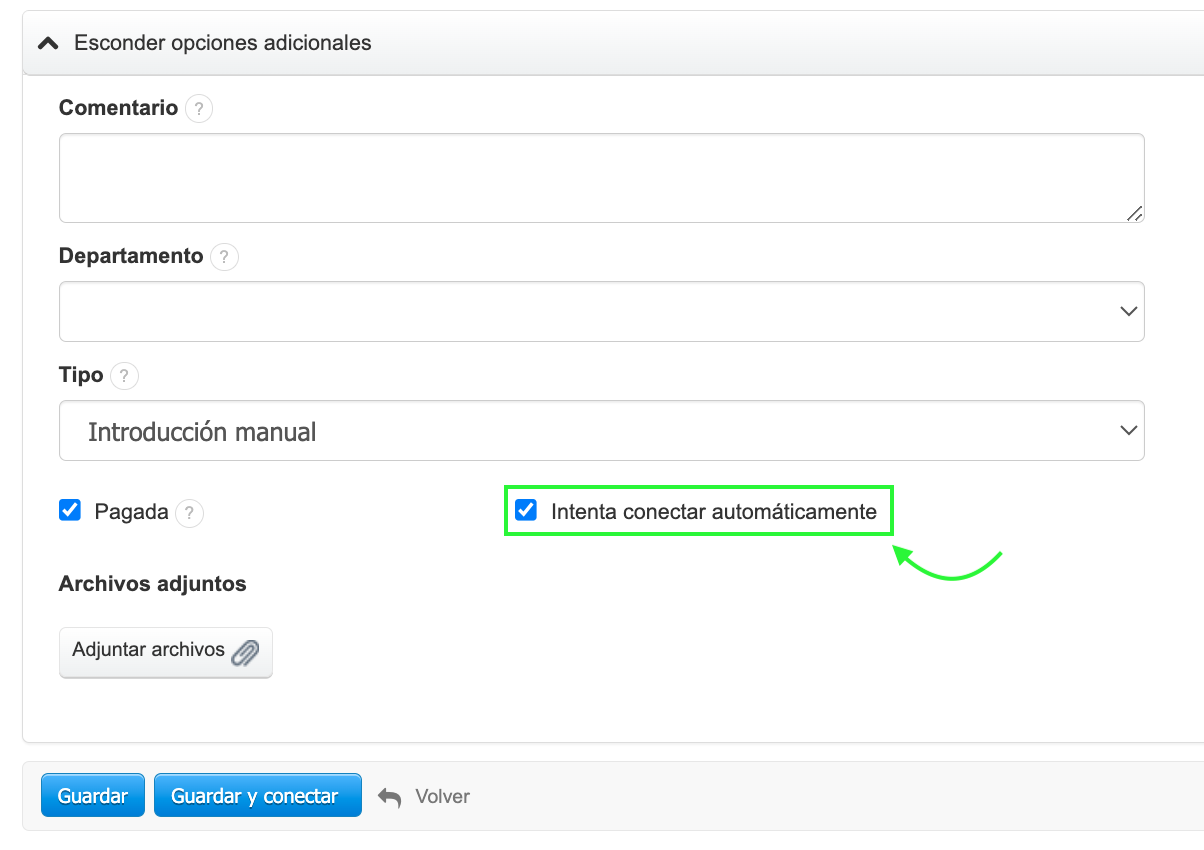 - Si haces clic en el botón Guardar, el sistema intentará hacer conectar el pago automáticamente (elegir la opción Guardar y conectar hará que el sistema intente vincular el pago y además mostrará una ventana donde esta información será visible; si el pago no se conecta automáticamente, en este paso podrás vincularlo manualmente).